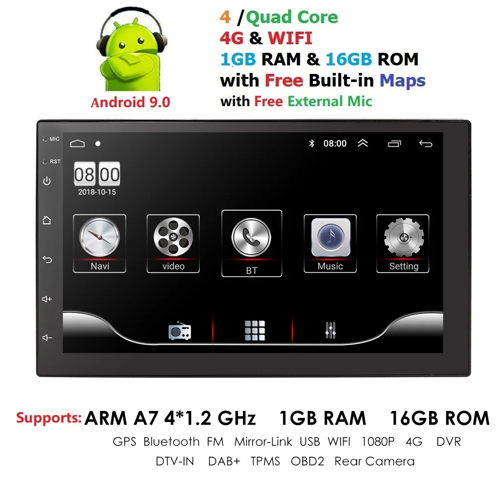 Universal 2 din Android 9.0 Quad Core Car Multimedia Player GPS Wifi BT Radio 4G SIM Network Steeri
